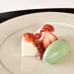 一見、パンナコッタかババロアか、添えられているのはピスタチオのアイスか、といった洋がメインのデザートに見えるが、一口食べてみるとしっかりと「和菓子」なのだ。