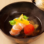 初夏から始まる「とうもろこしのかき揚げ」は秋まで続くこのシーズンの代表選手。丁寧に粒をはずしたとうもろこしを薄い衣で繊細なかき揚げにしている。これから夏に向けてとうもろこしは甘さとジューシーさを増し、ますますおいしくなるため、登場するのを待ちわびる常連も多いという人気メニューだ。
