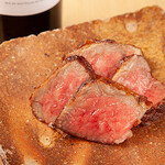 炭火焼きに使う和牛は、その時々で料理長の荒原さんがいいと思ったものを選ぶ。基本は赤身で、この日は通称「あか牛」と呼ばれる珍しい熊本県産の褐毛(あかげ)和種の肩肉だった。赤身の旨みが濃い肩肉を炭火でじっくりレアに焼き上げ、シンプルに塩でいただく。添えられているのは、ヒマラヤの岩塩、粗く砕いたカンボジアのコショウ、わさびだ。焼き上げる時には藻塩を使っているので、豊かなミネラルの旨みがのってそのままでも十分においしい。