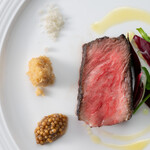 メニューは、21時までは月替わりのお任せコースのみ。5月のコースは旬の食材を使った前菜から始まり、トリュフがトッピングされたチーズラビオリ、兵庫県産純血但馬“淡路和牛”サーロインといった炭焼きを使ったメインまで8品と充実。どの料理もワインと相性抜群で、ワインが進みます。