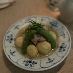 おすすめは、ドイツのややにごったオレンジワイン。「オレンジワインとしては渋みが強くなくさわやかなタイプでさっぱりとおだやかな肉じゃがにちょうどいいですね」と齋藤さん。最初は桃の香りを強く感じるふくらみのある風味だが、時間が経つに連れてグレープフルーツのようなさわやかな味になり、レモンバターの利いた肉じゃがにぴったりだった。