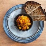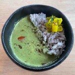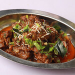 ビンダルーとはインド南西部ゴアの名物料理で酸味と辛味が特徴。具材はポークがポピュラーなのですが、このおでんビンダルーの豚はイベリコベジョータの肩ロースという豪華さ。巷間「良い素材はそのまま食べるのが一番」などと言われたり、「それをカレーにするなんてもったいない」という言葉をかけられりすることも少なくないのですが、こちらは素晴らしい食材をシンプルに味わった後でカレーに変化させたらもっとおいしくなるという素晴らしさを感じさせてくれます。