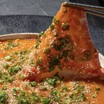 中でも味噌ユッケは、アイスクリームのような見た目がかわいらしく、お皿にひっくり返しすと、黄身がトロリ。そしてワッフルコーンを粉々に割っていただきます。食べる直前まで、写真を撮り続けたくなる一品。もちろん味も、味噌味のユッケにワッフルコーンの優しい甘さがピッタリとハマっています。ユッケと卵黄のとろりとした柔らかさに、コーンのパリッとした食感も楽しいですよ。