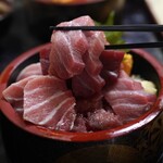 ネタは目利きの主人が毎朝豊洲市場で仕入れているため、鮮度抜群。おすすめメニューはその日の良いものを使った、日替わりの「おまかせ海鮮丼」2,600円。トロや活アワビ、イクラが入った贅沢な丼です。日によっては、ウニやボタンエビまで入るというから驚きです。ネタの下に隠れているたっぷりの中落ち、そのマグロの濃厚な味わいに、いくらでも酢飯が食べられそう。