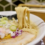 特筆すべきスープは、複雑で繊細な味の美しい魚介だしのスープ。芳醇な香りで、魚介の旨味がギュッと凝縮され、後から上品な動物の旨味が追いかけてきます。癖や雑味がなくあっさり優しい味。自家製の中太ストレート麺は、小麦の風味が豊かで、跳ね返るようなモッチリ食感が心地よい。ワンタンは毎朝手作りしていて、ジューシーな肉汁が噛むたびに溢れる一品です。