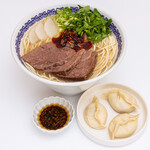 「蘭州牛肉面」が運ばれてくると、葉ニンニクから立つ香りが食欲をそそる。本店と同じ辣油の濃い赤も美しいが、まずは澄んだスープだけを召し上がれ。企業秘密でブレンドした多種の漢方が牛の旨味と重なり、滋味深さがこの上ない。すぐに胃がポカポカになり、目覚めるような感覚だ。