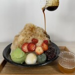 「くくりひめ珈琲」は、旬のフルーツを使ったパフェと自家焙煎コーヒーを楽しめる人気のお店。「くくりひめの夕涼み」には、抹茶、珈琲、アーモンドの3種類のシロップを使用するこだわりようです。フルーツもたっぷり使っているため、果汁のおいしさを存分に堪能することができます。食べ進めていくと、アイスクリームが2スクープ隠れているので、途中から味変を楽しめますよ。夏の庭園をイメージしているだけあって、見た目の美しさも◎。浅草でかき氷を食べるなら同店で決まりです。