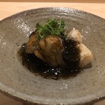 コースでは旬のネタを握った寿司と、季節の魚を目の前で焼き上げる藁焼き・炭火焼き料理などの自慢の品を交互に楽しめ、満足度が高いと既に評判になっています。寿司はネタに合わせて通常の酢と赤酢を変えたシャリがあり、それぞれ珠玉の一貫に仕上げられています。つまみは素材の良さを生かし、丁寧な技を加えた「牡蠣の燻製オイル漬け」や「ボタン海老の醤油漬け」「金目鯛の松笠焼き」など、お酒の進みそうな逸品ばかり。献立は月ごとに変わるそうなので、行くたびに季節の旬の食材を使った料理に出会えるのも楽しみですね。
