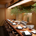 キッチン奥の壁に映し出されるのは、江戸時代の屋台などが描かれた浮世絵である。「昔の寿司はこんなに大きくて、しかも屋台で食べていたのか」など、主に海外からのゲストに向けて「学びと体験を合わせることで、江戸前の伝統や進化について少しでも考えてもらいたい」と、日本の食文化を発信する狙いだ。