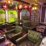 純喫茶ならではの昭和レトロな内装で、革張りのソファー、花柄の床、白いレースのカーテンと、懐かしい要素がてんこ盛りです。けれども店内は色ガラスのダウンライト、七色に光るネオン、巨大なブラウン管TVの中で発光するデジタルフラワーなどがスペースを彩り、きらびやかでカラフルで、今っぽさを感じます。まるでDJが古い曲をリボーンさせて新しい感覚で聞かせるように、美しい光が交錯し、古くて新しいドリーミーな異空間に迷い込んだよう。4名掛けのテーブルは10卓全てがゲームテーブルで、異なるゲームが用意されています。実際にコイン(1枚500円)を購入して遊ぶこともできます。オリジナルのコインもお花の形がかわいらしく、記念に持ち帰ることも可能。カウンターも2席あり、一人でも立ち寄りやすいです。