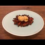 7,700円のおまかせコースに入る「豚のスペアリブ紹興酒の煮込み」は、お肉を醤油、砂糖、紹興酒、スープで柔らかくなるまで煮込み、餡をかけて仕上げています。ネギと生姜を香りが出るまで炒めて煮込んだスープを入れ、醤油と紹興酒で味を整えた餡は、シンプルな中に技が感じられる味わい。シェフもお気に入りの一品だそうです。