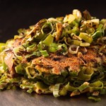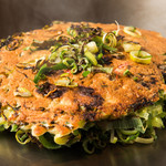 そして粉ものながら、醤油系の味でこれまたお酒に合う「ねぎ焼き」。こちらのお店は、粉を少なくして、できるだけ野菜を食べていると感じてほしいというだけあって、見るからにすごい量のねぎ! もはやはみ出してます。