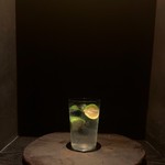 「塩レモン酎」700円は、ソルティドッグのようにグラスの縁に粗塩が付いた、おしゃれな一杯。甘すぎないレモン酎がさらにしまった味になります。
