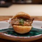 コースは「おまかせコース」22,000円のみ。季節の食材のおいしさを引き出す丁寧な料理7品ほどと、最後に鳥取産のたい喜米(オリジナル米)を土鍋で炊いたふっくらご飯と、混ぜご飯、ご飯が進むおかず数品をお膳でいただく「本日のご飯のおかず」、デザートで構成されています。中でも好評なのが、その時期の新鮮な魚介を使った「お造り」や、その場で自家製バンズを焼いて提供する「フィッシュバーガー」。「フィッシュバーガー」は2種類のソースで楽しめます。お浸しや餡かけなどの魚介と野菜の合わせ方も、バランスよく、同店ならではの味わい。