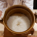 店内は吉野檜を主とし、和モダンな温かみのある雰囲気。カウンターの後ろにある窓からは緑が見え、落ち着いた空間を演出しています。ライブ感を楽しめるカウンターは8席。目の前で仕上げられる料理や、会話を楽しみながら、ゆったりと食事を楽しむことができます。