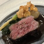 コースのメインは黒毛和牛のステーキや赤ワイン煮込みがよく出される。この月は、旨味の強いイチボのステーキ。肉料理の付け合わせには、野菜がたっぷり添えられているのもエッフェの魅力。「赤ワインと楽しんでいただきたいので、味付けは赤ワインソースにしています」と智一シェフ。