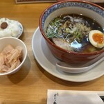 鶏がらに煮干しを合わされたスープを酸味の効いたコクのある醤油で仕上げられており、動物系と魚介系の旨みがとキレの良さも感じさせるコク深い味わい。