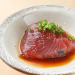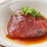 「カツオのたたき」は、千葉県勝浦産などのカツオを、提供する直前に串に刺して軽く炙り、自家製ソースをかけて提供される一品料理。