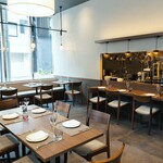 店内は天井が高く、店を囲む大きな窓からは光が差し込み、明るく開放的な雰囲気です。内装はモダンなブラウン系にまとめられ、落ち着いて食事を楽しめる空間になっています。客席はキッチンが見え、ライブ感を楽しめるカウンター4席と、くつろげるテーブル席が14席あります。