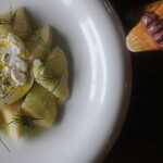 前菜の人気メニューは、季節のカプレーゼ。今の時期は山梨県産の桃を1個丸ごと贅沢に使ってブッラータチーズと合わせた「桃のカプレーゼ」が登場。ブッラータチーズは、優さんが修業したイタリアから直送されることも。日本人が好きなミルキーで濃厚なタイプを選んで使われている。ブッラータチーズにナイフを入れるとクリーミーにあふれ出て、口の中で桃の甘さとミントの清涼感が一体になってとろけ、たまらないおいしさがやってくる。