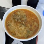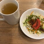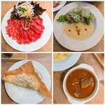 この日の野菜カレーが、鮮やかなビーツと四葉きゅうりのカレーという面白い組み合わせ。カレーと言ってもそれぞれ優しい味わいで、メインの肉カレーと合わせて混ぜながら食べることによっておいしさが増していく名脇役です。