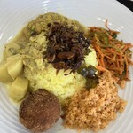 ポークカレーは程よいスモーキー感とスパイシー感で豚のうま味と甘味を感じられ、サラッとした口当たりなので他のカレーやおかずともよく馴染みます。バナナの蕾のふりかけが甘辛くて良いアクセントとなっており、このお店の個性が感じられるのが良いですね。
