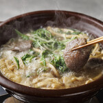 そしていよいよメインディッシュの「はりはり鍋」。はりはり鍋というのは本来大阪のくじら料理で、水菜をたっぷり入れて、そのしゃきしゃき感をはりはりと表した粋な鍋だ。それを「うずら」では、すっぽんの丸鍋を参考に、生姜を驚くほどたっぷり入れて、酒と昆布だしで仕上げている。