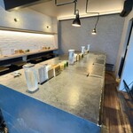 1階で注文、2階で飲食するようになっていて、階段を上がるとまるでダイニングバーのようなスタイリッシュな空間が広がっています。客席は、壁側のカウンターに6席、重厚感のある大テーブルに10席あります。お洒落で落ち着いた雰囲気なので、デート利用にもいいですよ。