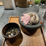 自慢のそばは、そば粉本来の香り、喉越し、食感を最大限に引き出すため、その日の気温や湿度により日々製法を変えて作る野川麺業の二八そばを使用しています。印象的な太麺は、モチモチとした食感と強いコシを楽しめます。そばは、存在感のある丸い石の器に盛るなど、器にもこだわっています。