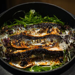 焼きあがったノドグロは寿司飯とたっぷりの九条葱とともに熱した器の中でぐつぐつしている餡の上にのせます。カリカリに焼いた皮と脂ののった身にとろとろの餡が絡み、ノドグロのおいしさが倍増します。