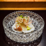 毛蟹の旬は冬と思われがちですが、漁師は身がやわらかく甘みが強い夏がいちばんおいしいと言います。その夏の毛蟹は酢のジュレとオクラと穂紫蘇でかわいらしく華やかな色合いのつまみに。仕上げに削りかけた柚子の香りが爽やかで夏を感じさせるひと皿です。