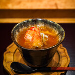 食べ進めていると「いくらをどうぞ」とトッピングしてくれます。ノドグロと寿司飯と餡という極上のあんかけ丼に、さらにいくらが加わりこの上ない口福感に満たされます。「お好みで」とかけた黒七味が味を引き締めます。