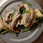 ランゴロには、おつまみとして食べられる具だくさんのパスタメニューが用意されている。おすすめは「カマスと焼きナス、すだちのオレキエッテ 自家製カラスミのせ」。オレキエッテは耳たぶの形をしたショートパスタ。カマスの骨でとっただし汁のソースでいただく。カマスも焼きナスもカラスミもたっぷりのった、まるでメインディッシュのような満足度の高い一品だ。