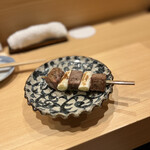まずは、刺身の盛り合わせ。のどぐろ、つぶ貝、明石の鯛、子持ちのぼたん海老、海ぶどうと、豪華だ。のどぐろは軽く炙って、脂ののりを引き立てている。旬のつぶ貝は、コリコリとした歯応えが楽しく、鯛は旨み充分。そして、とろりととろけるように甘いぼたん海老。これで3,000円はうれしい。日本酒が進むこと間違いなしだ。