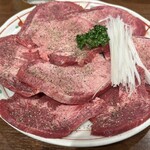 タンとお肉を一通り注文すると、まず出てきたのが、こちらのお店の本丸ともいえる「上タン塩焼き」2,970円。値段的にも一番お高いメインメニューをあえて一番最初にもってくる辺りがまた直球勝負の潔さを感じます! そして、この量!