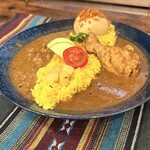 ターメリックライスを挟んで、ほろほろチキンカレーとポークジンジャーカレーの2種類が盛り付けられている。オープン3日間はスパイス卵が無料ということだったので、付けていただいた。