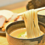 菅野製麺所と共同開発した特注麺は、福岡県産100%の国産小麦だけを使用。店主曰く、初めの一口はスープを付けずに食べてもらいたいとのことです。