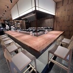 店内は、和を感じさせる高級感ある落ち着いた空間で、中央にある樹齢120年という松の盆栽が目を引きます。長いカウンターは、客席に程よい間隔が取られていて、1人でもくつろいで食事ができる雰囲気。4名用のテーブル席や、ソファが向かい合うボックス席もあり、家族やグループでの利用もできます。