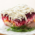 ロシア料理といえば真っ先にボルシチを思い浮かべる人も多いはず。トムヤムクン、フカヒレ、ブイヤベースと並んで世界を代表するスープの一つと言われ、鮮度のいいビーツを使った手作りのボルシチは目を奪われるほどビビッドな色味。食卓が一気にカラフルになり、一口すすればその滋味に心を奪われる。家庭や店によって作り方はさまざまだが「Anna’s Kitchen」では、寸胴で牛骨やすね肉、香味野菜などをゆっくり煮込み、フレッシュなおいしさをそのまま届けるために手でおろしたビーツを最後に合わせて提供する。最初はそのまま、肉の深い旨みとビーツの土の栄養を丸ごと吸収したような味わいを楽しみ、少しずつサワークリームをくずしながら食べるのがおすすめ。体と心にすーっと養分がとけこみ、素朴で心和む味に“日常の口福”を感じる。
