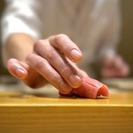 メニューは、先付、季節の逸品6品、握り12貫、細巻、お椀、甘味から成る「季節のおまかせコース」18,000円。使う魚は、旬や産地から魚体の水分、脂の乗り具合までを見極めて、熟成期間や締め方を調整するのだそう。