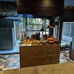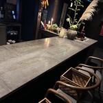 薄暗く、落ち着いた高級感溢れる店内、真ん中にお洒落な囲炉裏がみえるL字のカウンターでシェフが全ての料理の調理を行います。こちらは驚くことにガスは一切使用しません。変わりに熱源は炭・薪・藁で、食材の持つ美味しさを引き出すという斬新なスタイルです。