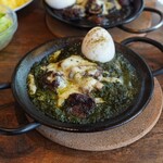 「ほうれん草チキンカレー」1,200円は、水を加えない濃厚なルーで、ほうれん草の味が口いっぱいに広がる個性的なカレーです。辛さは控えめですがスパイスの香りを楽しめ、パリッと焼かれた肉のうまみがたっぷりのチキンとの相性はぴったり。