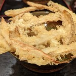福岡の業者から仕入れるごぼうを斜めに薄くスライスし、そのスライスしたごぼうに天かすが出づらい「大地のうどん」特製の天ぷら粉をつけ、15〜20枚を重なるように組み合わせながら170〜180℃の油で約3分かけて揚げる。