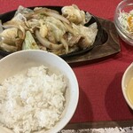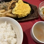 オリジナルにアレンジしたというハンバーグは、外側はカリッと香ばしく焼き上げられ、中はふんわりジューシー。銘柄豚のミンチで作っただけあり、上質な肉のうまみを感じられます。粗くみじん切りされた玉ねぎが、ほどよいアクセント。付け合わせにはもやしとニラを炒めたものと、ポテトフライが付きます。鉄板で提供されるので、最後までアツアツでおいしくいただけるのもうれしいポイント。副菜として「グリルピエロ」と同じく小鉢の冷奴も付いてきます。