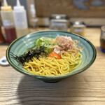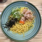 そして、2軒目は人気店「らぁ麺 はやし田」の系列店の「日本油党 渋谷総本部」。メニューは、「油そば」「ブラックジャンク油そば」「釜玉油そば」「たらこバター釜玉油そば」の4種類です。