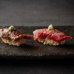 サーモンの後には西京焼きを挟み、もう一つのコースの目玉である肉寿司のお出ましです。2カンもなんて贅沢ですね!