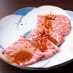 イチオシのメニューは「ザブトン」。ザブトンとは、肩ロースのあばら骨側にあり、サシがしっかりと入った、とろけるような食感が特徴の部位。同店では熊本産和牛を使用。あまりのおいしさにおかわりする人も多いのだそう。