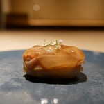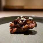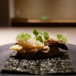 トップには毛蟹と揚げたカリフラワー、柿酢で味付けした菊の花を添えてある。高嶺の花のような凛とした佇まいからは想像できない、新感覚の多彩な味わいが口の中に広がるが、ホクホクの海老芋、だしの味わいはどこか懐かしさも覚える一皿だ。細部まで洗練された可憐な見た目、意外性のある食材の組み合わせと相乗効果で生まれる新たな味、そこに親しみのある味わいが同居するのが野田シェフらしさなのかもしれない。