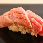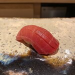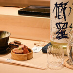 メニューはおまかせコースのみで、ランチは18,400円、夜は18時からで34,500円(20時半からの2部は要相談)。店主が毎朝豊洲で仕入れる新鮮な魚介や近海マグロなどを使った贅沢なコースです。毎日足を運ぶことで、市場の方との信頼関係を築き、鮮度の良い旬の食材を仕入れられるのだそう。赤酢のシャリを使った名店仕込みの技による寿司は、シンプルながら奥深い味わいと好評を得ています。