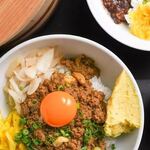 メニューは5種類で、基本のゆるキーマ、辛さを抑えた「白 マイルドカレー」850円と、定番の中辛ゆるキーマ「黄 魔皿カレー」900円、超辛口のゆるキーマ「赤 デビルカレー」950円、お肉たっぷりの「玉 ドライキーマカレー」1,200円、ビーフとポークの合いびきで作った特別な「魔 ドライキーマ」1,500円です。カレーは丼で提供され、副菜の玉ねぎ、きゅうりのピクルス、マッシュポテト、キャベツが盛られてきます。さまざまな食感と個性的な味わいの副菜は、カレーのおいしさをどんどん変化させてくれます。トッピングの「半熟たまご」100円や「てんかす」100円なども、おすすめです。ご飯とルーは、それぞれ+100円で大盛に変更可能で、金曜日はライスがターメリックライスになるそうです。